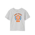 Dieses kurzärmlige T-Shirt ist aus weichster Baumwolle gefertigt und hat einen orangenen und blauen Aufdruck im Retro-Look. Es hat einen Rundhalsausschnitt und einen abgerundeten Saum.