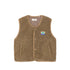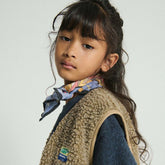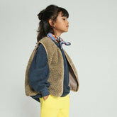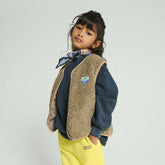 Eine weiche und lockere Kinderweste in Teddy-Optik. Mit Druckknöpfen und zwei Taschen vorne. Es ist die perfekte Weste für den Übergang, zum schnellen Überziehen oder Unterziehen unter der Winterjacke für extra Wärme.