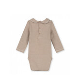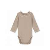 Ein langärmeliger Body mit süßem Kragen, aus einem weichen Bio-Baumwolljersey und ein wenig Elastan für die perfekte Passform. Er hat lockere Schulterpartien und einen Druckknopfverschluss im Beinbereich.