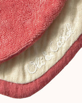 Ein dreilagiges Lätzchen — die Vorderseite ist aus Bio-Baumwollmusselin, das Zwischenfutter aus Bio-Baumwollmusselin für trockene Haut und Rückseite aus saugfähigem Baumwollfrottee.