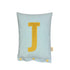 Buchstabenkissen J – Messing auf Hellblau mit kleinen weißen Pünktchen
