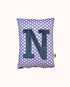 Buchstabenkissen Blaugrau auf Flieder mit weißen Punkten