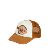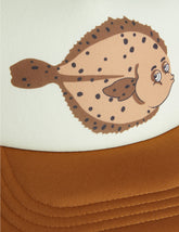 Mini Rodini's Trucker Cap mit Flundra-Print auf der Vorderseite aus 100% recyceltem Polyester. Für die perfekte Passform ist die Cap hinten verstellbar.