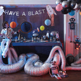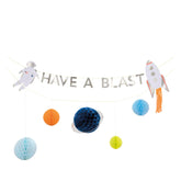 Die Kombination von zwei Girlanden in einer ergibt die fabelhafteste Dekoration. Eines trägt die Aufschrift „Have A Blast“ und einen glänzenden Raumfahrer und eine Rakete, während das andere bunte Wabenplaneten zeigt. Es wird Ihre Gäste garantiert begeistern!