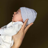 Diese Mütze ist für Neugeborene und Babys entworfen, um die kleinen Köpfe kuschelig warm zu halten. Hergestellt aus weichstem Bio-Baumwolljersey mit ein wenig Elasthan für die perfekte Passform. Das Gray Label Logo ist auf der rechten Vorderseite der Mütze aufgenäht.