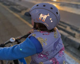 Mit dem lustigen Sticker ist jeder Tag eine Party. Klebe die fröhlichen Sticker auf deinen Helm oder Roller und lass dich anstecken von der guten Laune. Außerdem leuchten sie bunt — auch in der Nacht. Mit den reflektierenden Stickern kommst du ein kleines bisschen bunter und besser nach Hause. Illustriert von Anna K. Jansen.