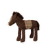 Das braune Pony ist aus einem weichen Baumwoll-Leinen-Stoff gefertigt. Die Mähne und der Schweif bestehen aus Baumwollschnüren und der Sattel ist aus weichem Strickgewebe gefertigt, das eine komfortablen Ritt garantiert.