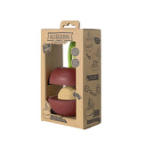 Das stapelbare 3-in-1-Spielzeug ist ein Rassel- & Hüpfball sowie Stapelspielzeug aus 100 % Naturkautschuk und gefüllt mit recycelten Kirschkernen.