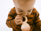 Das Produkt ist mit lebensmittelechter Bio-Farbe handbemalt sowie frei von PVC und BPA. Das weiche, kaubare Material macht es besonders angenehm für kleine Hände und eignet sich auch ideal wenn die ersten Zähne kommen. Dank der hermetischen Versiegelung können sich weder Schimmel noch Bakterien im Inneren ansammeln — für maximale Sicherheit beim Spielen.