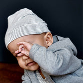 This hat is designed for newborns and babies to keep their little heads cozy and warm. Made from the softest organic cotton jersey with a little elastane for the perfect fit. The Gray Label logo is sewn on the right front of the hat.