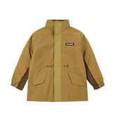 A khaki-coloured raincoat made from 100% recycled polyamide. Features include a hood, long sleeves, an adjustable waistband, a snap-button and zipper closure, elastic cuffs, a flap pocket, and a very comfortable fit—a practical and stylish jacket for your child.