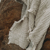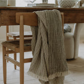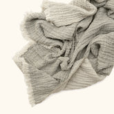 Garbo&Friends Mellow blankets are made from a combination of 55% linen and 45% cotton, which gives this blanket a beautiful structure. The blanket has a medium thickness so it can be used anywhere in the house. It is double sided and features the Garbo&Friends signature embroidered G. The Kale color is a beautiful pale green, the color is the result of the two layers merging together in the fabric.