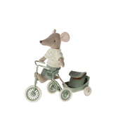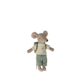 Die große Bruder Maus ist für einen Tag im Kindergarten oder in der Schule angezogen und trägt ihren Rucksack auf dem Rücken. Er hat Magnete in den Händen, damit er die Griffe des Dreirads für eine schnelle Fahrt halten kann.