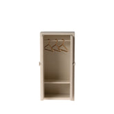 A small wooden wardrobe. It helps the mouse family organize their wardrobe. The wardrobe comes with three golden hangers.