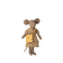 Mama Mouse made of light brown fabric. She wears a dress and a bag with cheese holes. This mouse fits mouse-sized furniture and accessories. Mommy/Daddy-sized clothes fit this mouse.