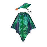 This set includes a lined metallic green winged cape with headpiece. It features a black glitter elastic band with velcro fasteners.
