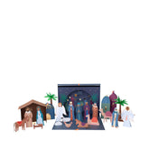 Delivery: It is presented in an illustrated box with a neon coral ribbon for opening and closing. It has numbered doors with fold-out figures, animals, a stable and props. The background has an arch detail decoration that features a hanging shooting star.