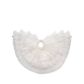 This beautiful white lined and layered tulle cape with wings closes securely with a snap closure.