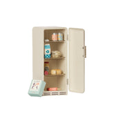 A vintage fridge that fits perfectly in the miniature dollhouse. The fridge is made of metal with a magnetic closure and frosted shelves inside. A great addition to this fridge is our miniature food box.