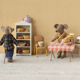 Mama Mouse made of light brown fabric. She wears a dress and a bag with cheese holes. This mouse fits mouse-sized furniture and accessories. Mommy/Daddy-sized clothes fit this mouse.