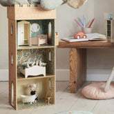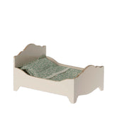 The perfect bed for a restful sleep. It features beautiful details such as a golden finish on the wood and beautiful fabrics for the bedding. Two mice can easily sleep next to each other, as it's suitable for big sister/brother mice.