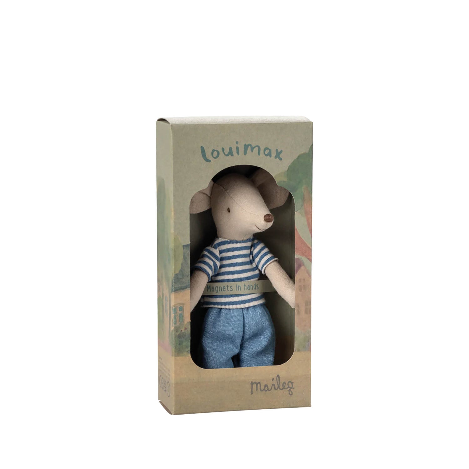 This mouse is called LouiMax and is a really adventurous guy. He wears a blue striped shirt and jeans. The mouse has magnets in his hands and comes in a nice decorative box.