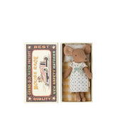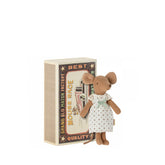 A classic Maileg item. Ready for hours of play, this mouse sleeps soundly in the matchbox. The clothes and bedding come with unique Maileg prints and beautiful colours.
