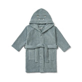 Ein kuscheliger Bademantel mit Tiermotiv, der praktisch und angenehm zu tragen ist. Die dichte Frottee-Baumwollqualität hält die Kleinen trocken und kuschelig.