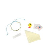 - Jedes enthält einen Witz, Folienaufkleber, ein Freundschaftsarmband, einen gelben Seidenpapierhut und ein Küken